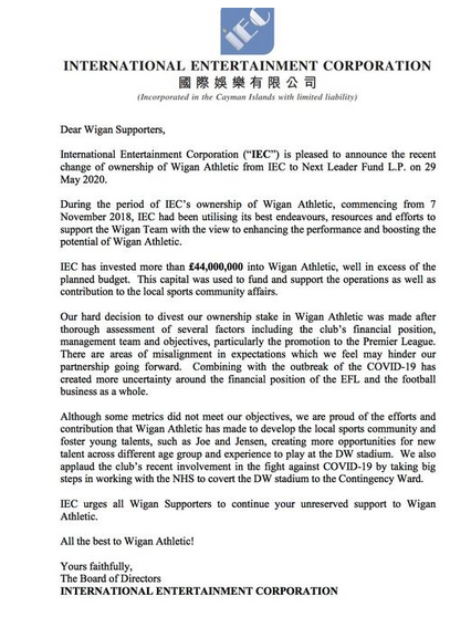 The period of ownership of Wigan Athletic by IEC was some 19 months, during which the club has been in the Championship division. In November 2018 when IEC took over Latics were struggling on the field of play. That continued until a 2-1 away win at Leeds in April 2019 sparked a revival that saw them escape the relegation zone. However, accounts published in June 2019 showed that the club had made a net loss of £9.2m, their eighth consecutive loss for the season.