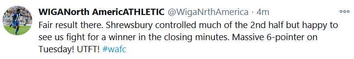 It was a dire game with Wigan’s main mode of attack being hopeful long balls, which the solid Shrews defence devoured. But it is another point gained as the transfer window looms, as does the ratification of the Moreno deal.