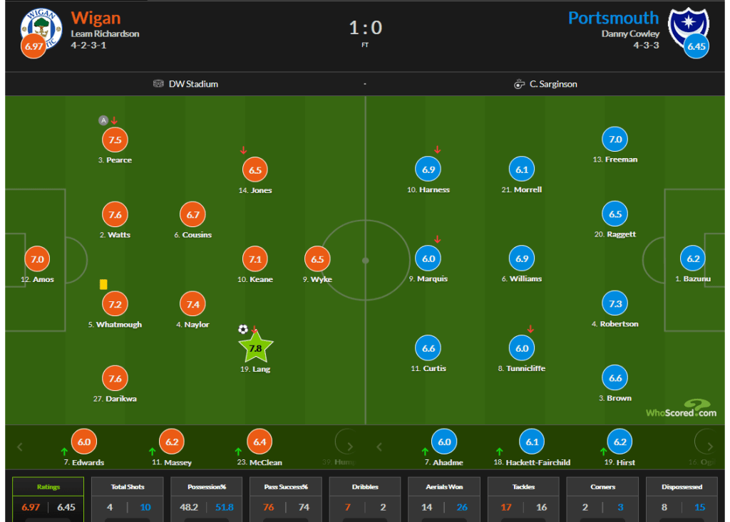However, the visitors immediately settled into their stride, their smooth running and passing movements depriving Wigan of possession. Fortunately, this Latics team is better set up defensively than most, with a solid goalkeeper and a cohesive back four and holding midfielders who do so much to shield the defence.  The downside for Latics was the return of that hoofball/hopeful long ball approach that remains dormant in the players’ mindsets. Going into half time one hoped that Latics could get the ball back on the ground and challenge a Pompey defence that had been underworked up to that point. The defence had held firm and the visitors had not scored.