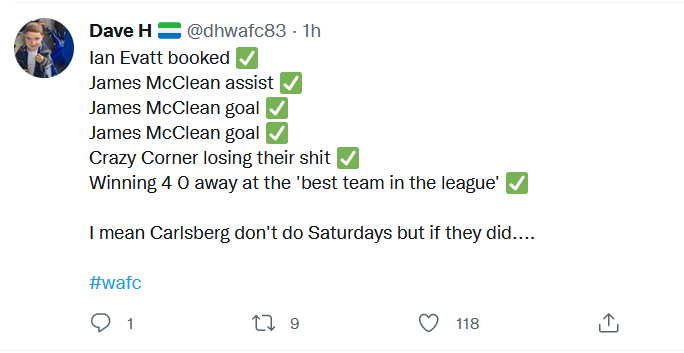 Simply wonderful and the best thing was that wasn’t even the best we’ve played this season. We were better against Wycombe. An absolute pasting and credit to Ian Evatt for the assist with his pre match team talk. Well in Jimmy Mc!