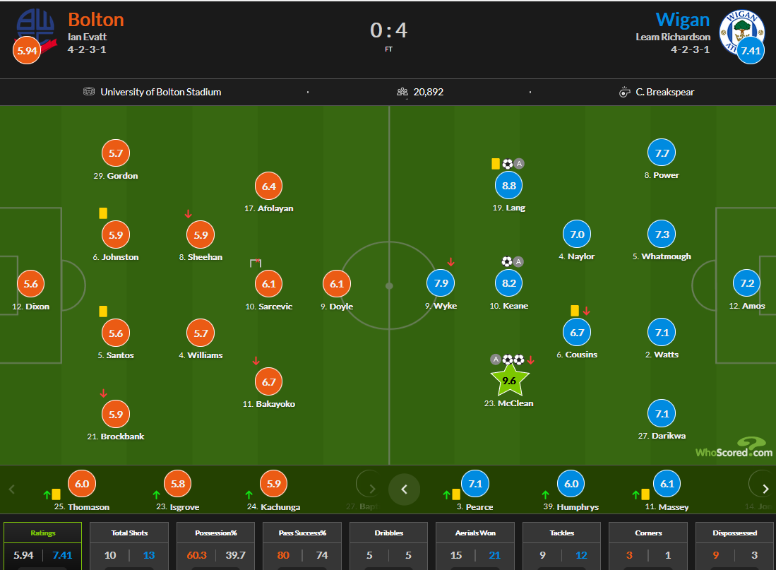 What a scintillating performance from Wigan! They bossed this game from start to finish, outplaying the home team. Will Keane’s 6th minute goal got Latics off to a flying start. The home team’s main threat was from inverted left winger Dapo Ofolayan, a capable player, but one who has the ability to fall to the ground after the mildest of challenges. His threat was nullified by crowding him out and the tactic seriously hindered Bolton’s attacks. Wigan’s defence was rock solid and they were full of energy in midfield and up front, with the line superbly led by Charlie Wyke.