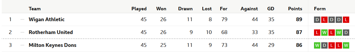 In purely mathematical terms Wigan Athletic took a further step towards promotion last night. Losing by a one goal margin means that they go into the final game of the season at Shrewsbury with a +6 goal difference advantage over MK Dons. The odds against MK overcoming that goal difference are very high as they must travel to Plymouth to face a team eager to cement a place in the layoffs.
