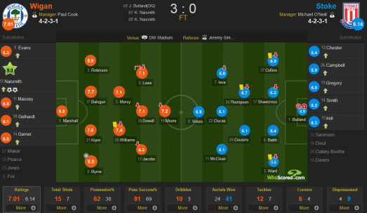 Wigan’s beleaguered defence did well to keep the home team at bay in the first half, despite Fulham’s dominance of possession. The game was goalless at half time, although it had looked like it was going to be a matter of time until Fulham scored. The London team had had twelve shots to Wigan’s one in that first half. Could Cook make some changes for the second half to nullify the home team’s dominance?
