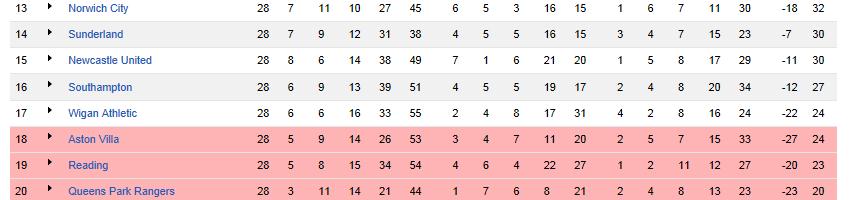While it does heap pressure on the next fixture, I don’t see this draw as a big problem. Of the next three, Latics probably need 6 points: Swansea (h), Norwich (a), and WBA (h). Results elsewhere this weekend were favourable. Most encouraging was QPR’s loss to Fulham. QPR still face the league’s top six clubs in their remaining 12 games. Blackburn and Bolton both lost to strong opposition, but a more important loss to Blackburn came in the form of Christopher Samba’s transfer to Russia — an important player and leader for them. Wolves may have gotten a point at Newcastle but failed to appoint a new manager of any pedigree, and still look in deep trouble. Latics’ next match against Swansea is pivotal. If we fail to win that one, we are going to be in need of points at places like Anfield or Stamford Bridge, not a situation we want to put ourselves in. We hit the post three times last time we played Swansea. A bit of luck this time could see us out of the bottom three.