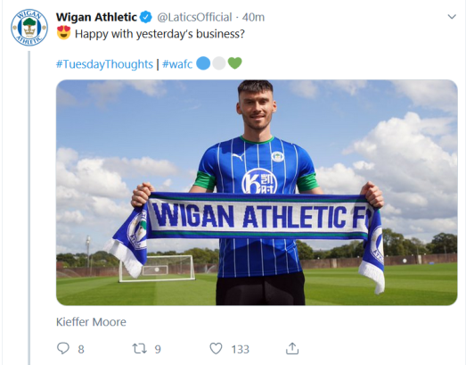 Barnsley FC yesterday announced the transfer of the 6ft 5in centre forward Kieffer Moore to Wigan Athletic. The 26-year-old has signed a three-year contract.