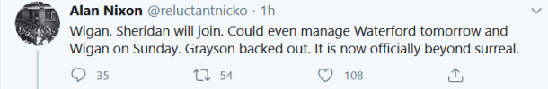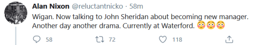 Today’s tweet from Nixon stirred the waters even more. Like Grayson, John Sheridan is a very experienced manager and would merit consideration. But if it is true it asks questions about the administrators’ role and what is happening with their search for new owners.