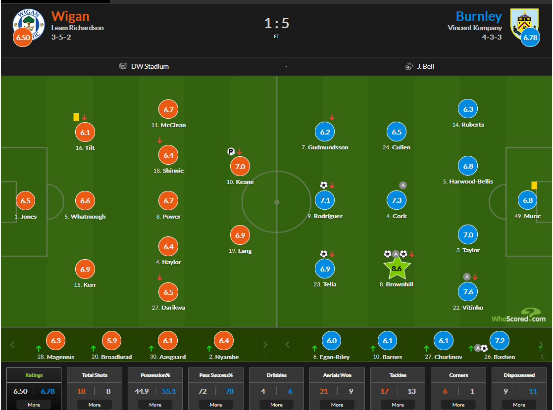 During the week Touré had lauded the skills of Will Keane. The player responded with one of his most complete displays for Wigan. His opportunist goal brings his season tally to 9, well on the way to a 20-goal season. Moreover, his passing and nimble footwork enabled him to be at the fulcrum of a series of flowing moves during the first half. He will benefit from the style of play that is going to characterise the Touré era.
