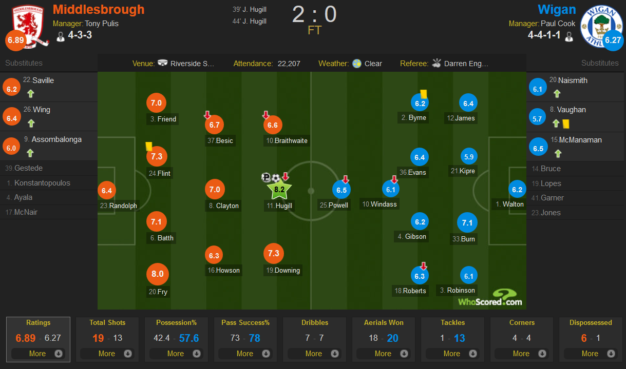 The overall match stats show the home team winning 62% of aerial duels compared with Wigan’s 38%.