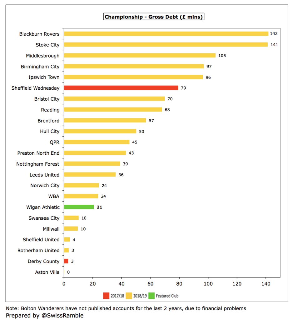 The Swiss Ramble figures for 2018-19 show Wigan Athletic with a lower gross debt – £21m – than most Championship clubs, being dwarfed by the £142m of Blackburn Rovers. Given the recent actions of the administrators that debt is being reduced.