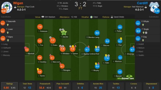 Cook kept faith in the enigmatic Josh Windass, who went on the score the first goal and have a hand in the other two. Playing without a big man up front means puts an onus on defenders and midfielders to be more creative. Windass has genuine pace that allows him to pounce on well-hit long passes. It is so refreshing following the mindless long-ball approach that characterized Wigan’s away performances for so long.