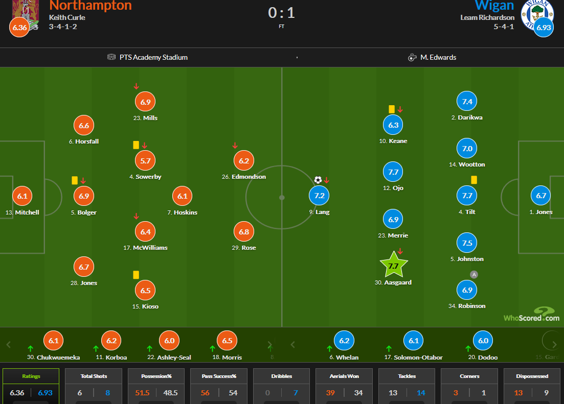 The left back position has been problematic for Wigan all season. Joe Bennett’s recuperation from serious injury has been slow. Tom Pearce has signed a new contract but is again injured. Darikwa has done his best to fill in on the left, but it is not his best position. Pushing McClean to left back in the second part of the game meant that Wigan lost much of his attacking thrust. Lang thrives on Max Power’s accurate long passes down the right wing from the full back position. That stopped when Power was pushed into midfield.