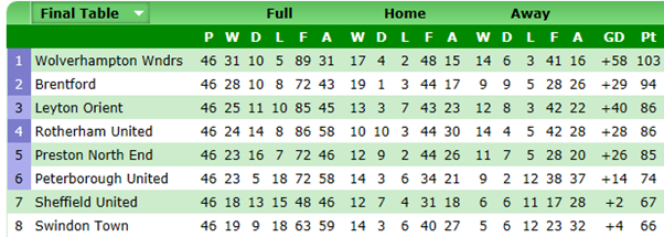 But the London club eventually finished 3rd, losing out to 4th place Rotherham in the playoffs. Wolves, loaded with big parachute money and ex-Premier League players, ran away with the division in the second half of the season: