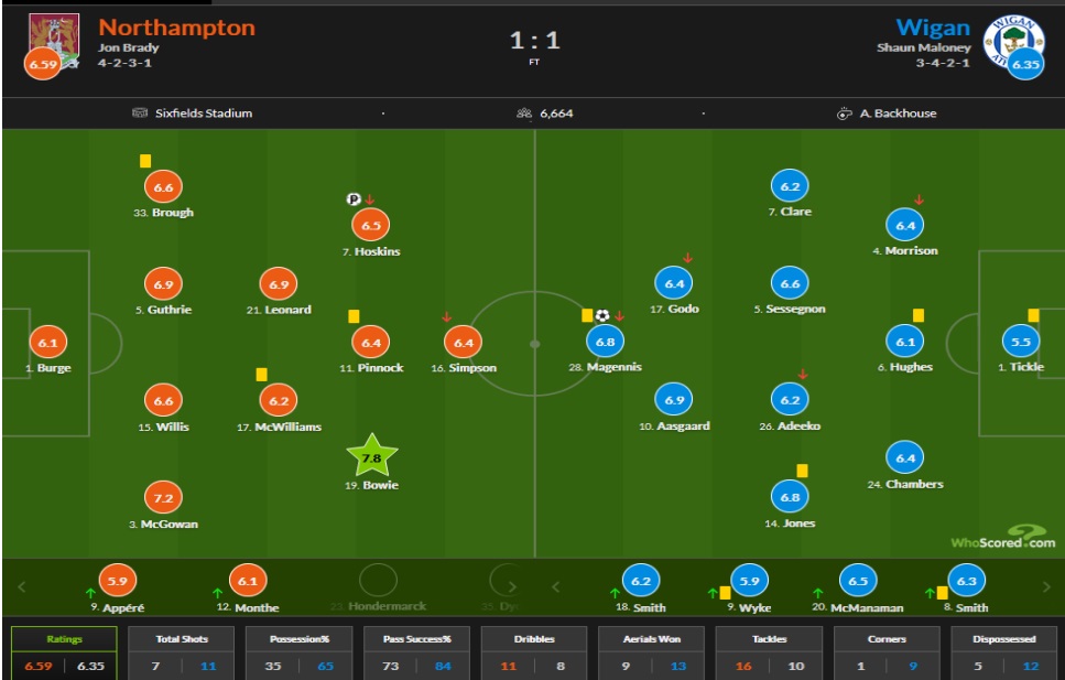 No changes were made at half time, but there was an improvement in the tempo from Latics. After 61 minutes Maloney made a tactical adjustment took off centre back Liam Morrison, bringing on Callum McManaman. He also brought on Matt Smith for Adeeko. Smith immediately stamped his class into Wigan’s play and his defence-splitting pass to Martial Godo provided a tap in for Magennis after 64 minutes.