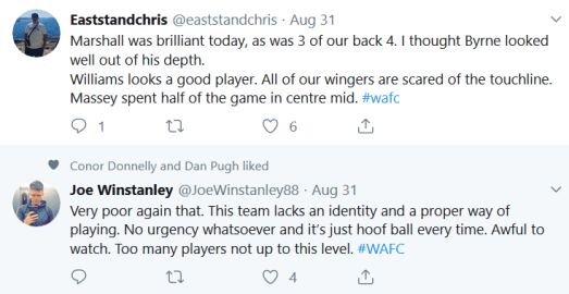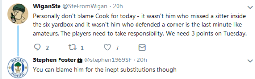 A feature of Cook’s strategy in the two games since the season restarted is that he has used less substitutions than the opposition managers. Tony Mowbray used five yesterday whereas Cook used three, with Joe Garner coming on in time-added-on. The upside of Cook’s approach is that it has caused less disruption to the flow of Wigan’s play. The downside is that there is another match coming up on Tuesday and some players, Jamal Lowe and Kieffer Moore in particular, looked very tired in the closing minutes.