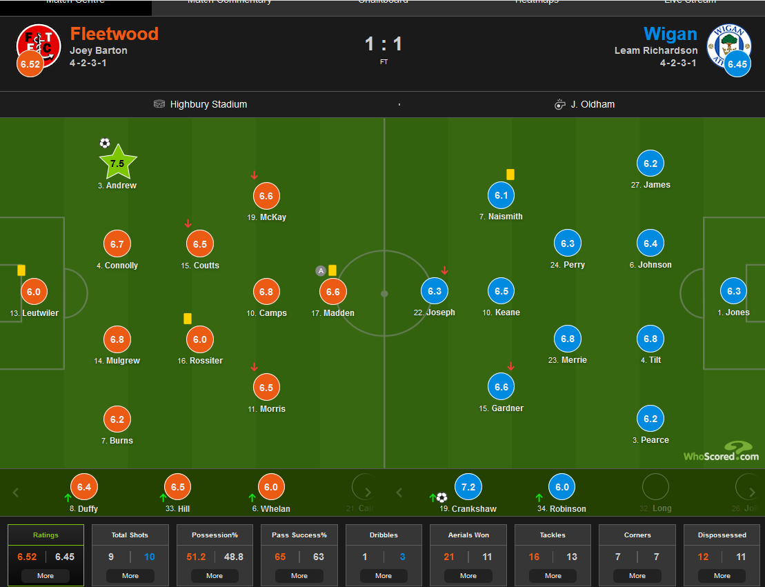 So much of Wigan’s play was based on the long-ball, but when they did get the ball out to the wings they posed problems for the home team defence. Latics had started the game without Kal Naismith, their key creative player. It was a surprise to see Thelo Aasgard start in left midfield in place of Dan Gardner.