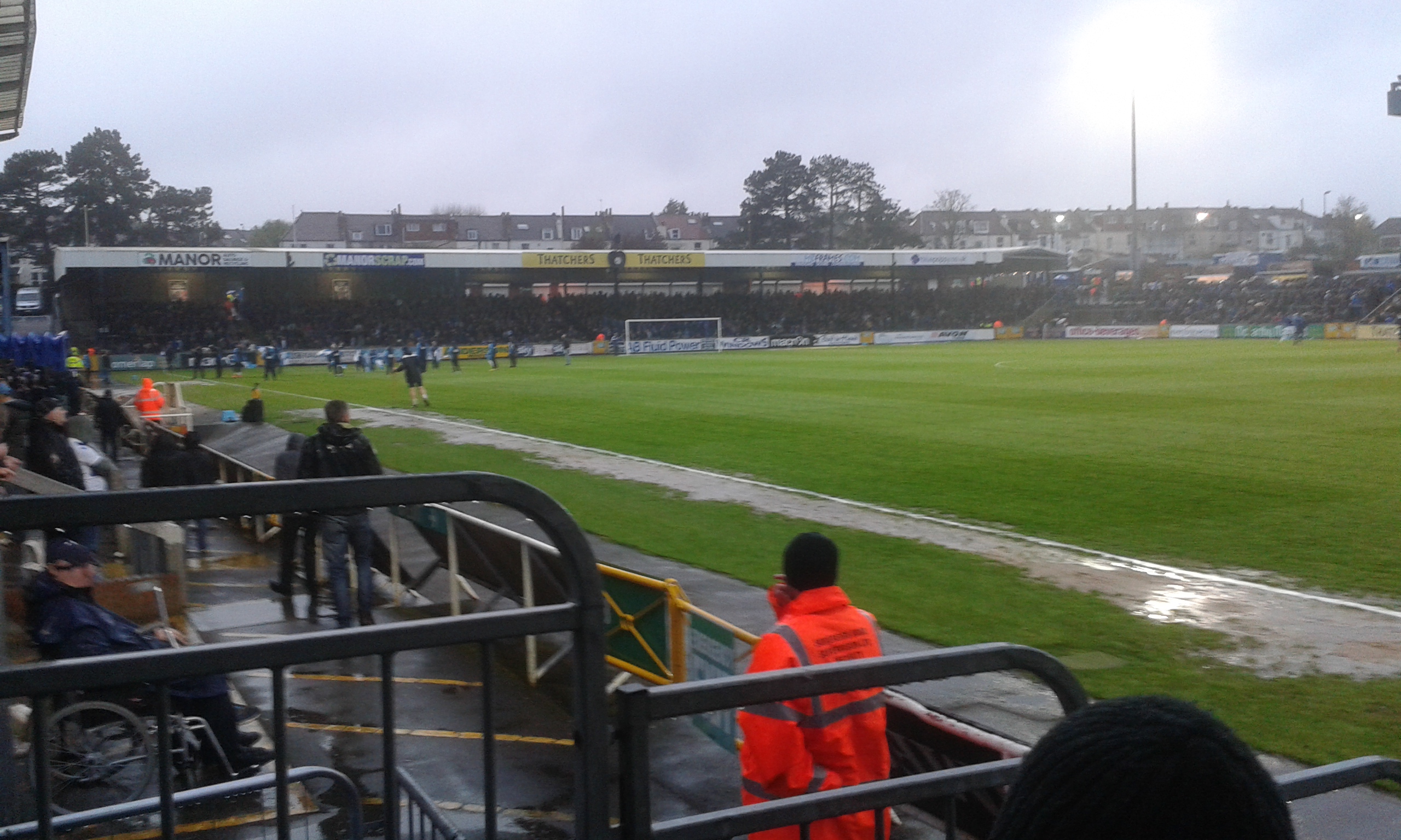 The Memorial Ground was named in honour of rugby union players who died in the First World War. It hosted rugby from 1921 until Bristol RUFC moved to Ashton Gate in 2014. Bristol Rovers moved there in 1996 and, despite efforts to build a purpose-built stadium elsewhere, remain rooted at the old stadium. Arriving there last night in torrential rain I asked a steward how to find my seat, being told that it was under the canopy around the corner. The term “temporary stand” did not fully depict that canopy.