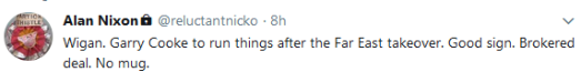 Last night I had watched an excellent first half performance at Tranmere by the youngest side in memory fielded by Wigan Athletic. They scored two cracking goals: a Will Keane header from a cross by Tom Pearce and a rasping drive from outside the box by the 18-year-old Charlie McHugh. The performance was slightly tainted by a schoolboy error that gifted the home team a goal, but the level of movement and accuracy of passing was way above what we have seen in recent weeks. During the half time interval I checked Twitter to see if anyone had posted an opinion on the game so far.
